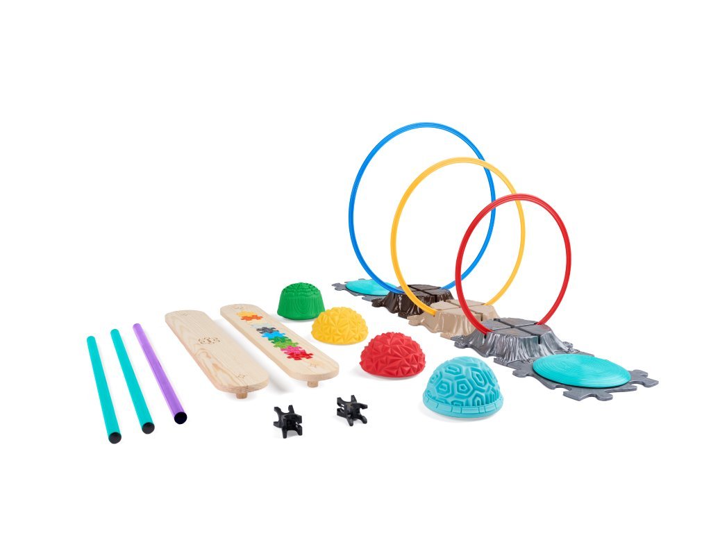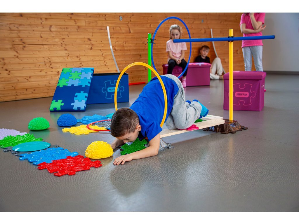 Velká překážková dráha slouží jako balanční podlaha se spousty prvky jako jsou plastové tyčky, ploché kruhy, dřevěné lávky, rotační podložka Rotana a balanční kameny.