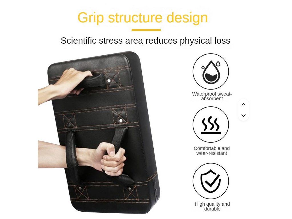 Design a úchopy: Štít je vybaven několika zesílenými popruhy/madly na zadní straně, které umožňují různé způsoby držení (vertikálně i horizontálně) a zajišťují pevný úchop i při silných nárazech.